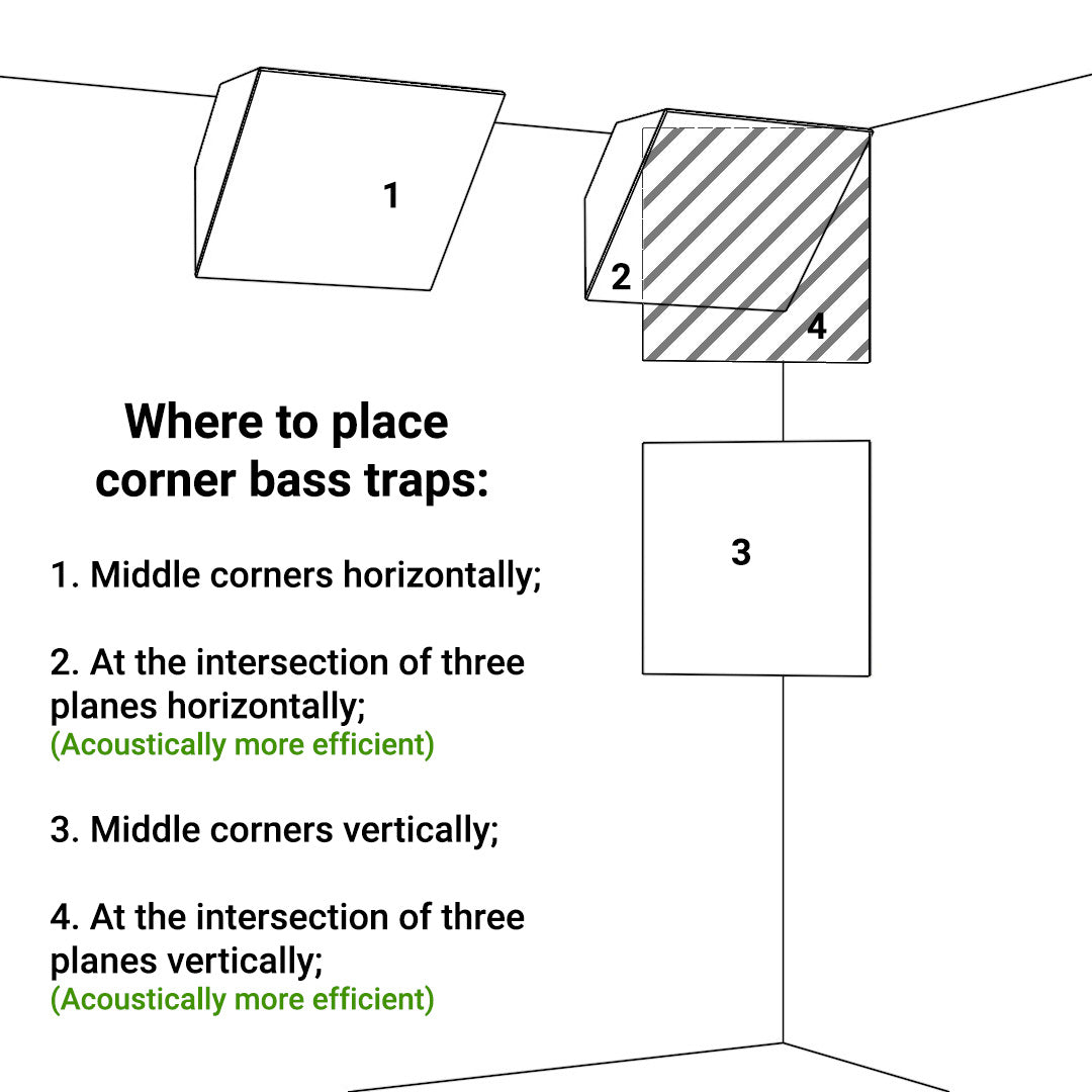 Bass Traps werken door de willekeurige 'omni-directionele' basenergie op te vangen die zich neigt te clusteren in hoeken en de kamer overweldigt. Ze hebben het positieve effect van het verminderen van vervaging en het geven van meer definitie en punch aan de bas, waardoor je de laagfrequente energie kunt beheersen en je studio een strakkere, meer gecontroleerde bas kan bereiken. De meeste akoestische ingenieurs voor akoestische geluidsbesturing hechten altijd belang aan dergelijke plaatsen in de kamer als de hoeken van de kruising van muren. Dit is voornamelijk gebaseerd op hoe het geluid wordt verdeeld binnen de ruimte waarin de muren en plafonds fungeren als geluidsgidsen die het geluid naar de hoeken leiden waar het zich ophoopt in het laagfrequente gebrom dat resonanties veroorzaakt.